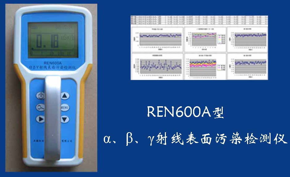 • REN600A α、β、γ多功能污染儀REN600A型α、β、γ射線(xiàn)表面污染檢測(cè)儀即可檢測(cè)α、β、γ射線(xiàn),也能檢測(cè)到X射線(xiàn),它采用高速嵌入式微處器作為數(shù)據(jù)處理單元,點(diǎn)陣式大屏幕LCD液晶顯示,讀數(shù)清晰、操作方便,具有400條超大容量數(shù)據(jù)存儲(chǔ)。儀器采用進(jìn)口的大面積MICA蓋革探測(cè)器,具有較高探測(cè)效率,可進(jìn)行α、β輻射表面污染檢測(cè)和X、γ輻射劑量率的監(jiān)測(cè)。此外通過(guò)配套的RenriCont表面污染管理軟件可將存儲(chǔ)的數(shù)據(jù)讀出后分析?蓮V泛用在制藥廠(chǎng)、實(shí)驗(yàn)室、發(fā)電廠(chǎng)、進(jìn)出口商檢、采石場(chǎng)、環(huán)境實(shí)驗(yàn)室、環(huán)境污染調(diào)查、核安全應(yīng)急、緊急狀況營(yíng)救站、金屬處理廠(chǎng)、地下油田、供油管道裝備、醫(yī)院核醫(yī)學(xué)科、同位素實(shí)驗(yàn)室