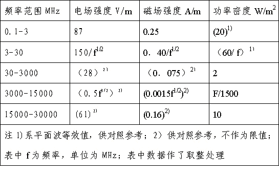 4、對于脈沖電磁波,除滿足上述要求外,其瞬時(shí)峰值不得超過表中1、2所列限值的1000倍。